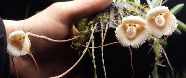 The monkey orchid has almost one hundred and twenty species which all differ in color and size. In 1978 botanists described this species, and journalists placed it in all magazines. So the whole world learned about the new flower. Short stems have long and narrow long leaves in the form of a belt.