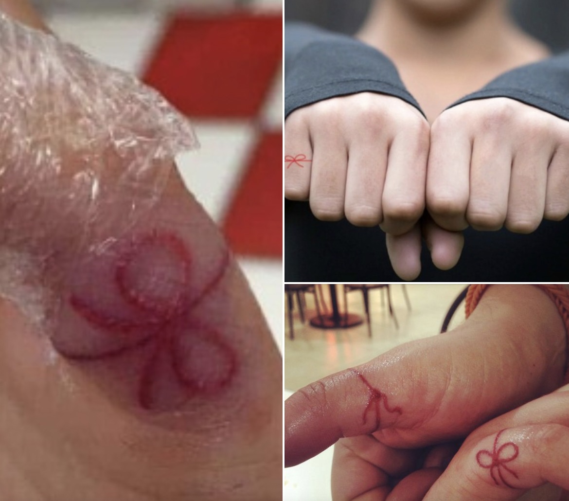 So I did a little digging – thanks, internet – and found that the red string tattoo in question is known in Asian cultures as the ‘red string of fate’. Most commonly appearing on the thumb of a man and the pinky finger of a woman, the tattoo looks like a simple bow with tails, not unlike a tied shoelace.