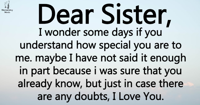 Dear Sister. I wonder some days if you understand how special you are to me. maybe I have not said it enough in part because i was sure that you already know, but just in case there are any doubts, I Love You. Written by Jane Craft