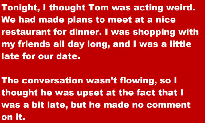 Tonight, I thought Tom was acting weird. We had made plans to meet at a nice restaurant for dinner. I was shopping with my friends all day long, and I was a little late for our date.The conversation wasn’t flowing, so I thought he was upset at the fact that I was a bit late, but he made no comment on it. So I suggested that we go somewhere quiet so we could talk. He agreed, but he didn’t say much. I asked him what was wrong; He said, ‘Nothing.’ I asked him if it was my fault that he was upset.