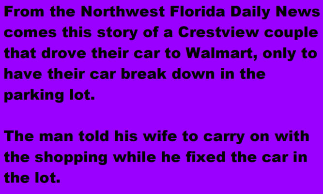 From the Northwest Florida Daily News comes this story of a Crestview couple that drove their car to Walmart, only to have their car break down in the parking lot.