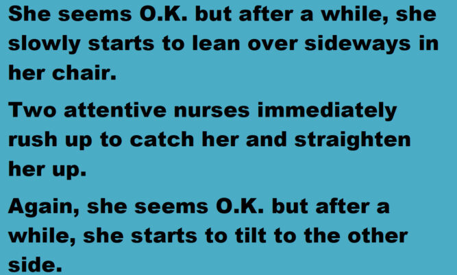 The woman in this joke experienced that truth whenever she was put in a nursing home. She was having a difficult time staying upright in her chair, but there was someone there to help her every time she started to lean over.