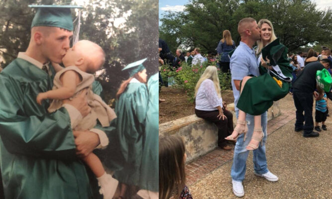 Some re-creation photos take things to an entirely different level, and we see one here. It happened when Dennis Roach posted a picture in 2018 at his daughter’s high school graduation.