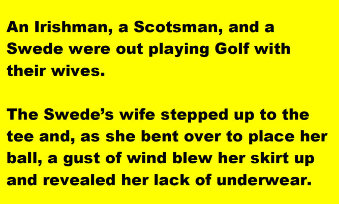 The Swede’s wife stepped up to the tee and, as she bent over to place her ball, a gust of wind blew her skirt up and revealed her lack of underwear.