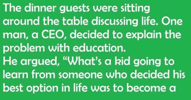 The dinner guests were sitting around the table discussing life. One man, a CEO, decided to explain the problem with education. He argued, “What’s a kid going to learn from someone who decided his best option in life was to become a teacher?”