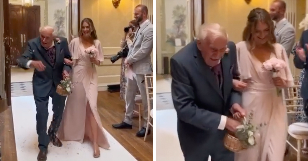 In the video, Rachel’s grandpa, Bert Edlin, led the wedding procession with a basket of petals, throwing them out as he beamed with pride.