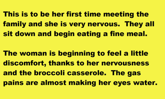 That was exactly what was happening to the woman in the following story, but her nerves took a turn that was unfortunate, to say the least. Between the dinner they were eating and her nerves, she built up quite a backlog of gas.