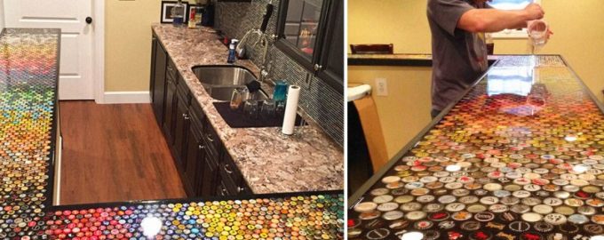 A table made of beer caps and epoxy was a great solution for a boring home interior.