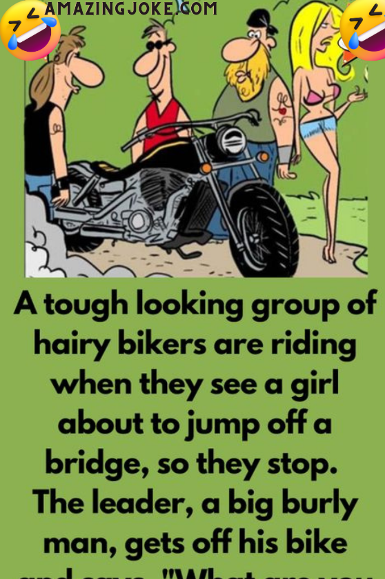 A tough looking group of hairy bikers are riding when they see a girl about to jump off a bridge,