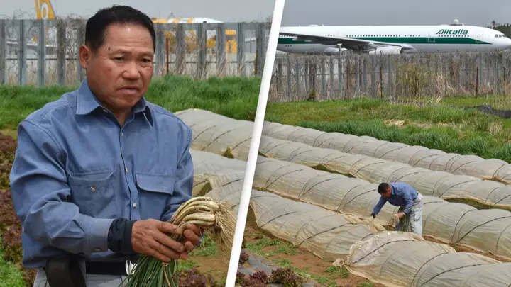 An elderly farmer who has refused to give in to developers steadfastly continues to grow vegetables on his farm which is now in the middle of an airport.
