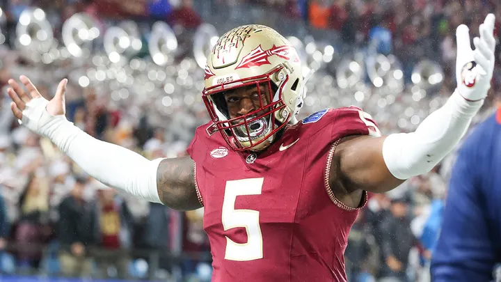Deuce Spann of the Florida State Seminoles gestures in the final minutes of the ACC Championship game at Bank of America Stadium on Dec. 2, 2023. (Isaiah Vazquez/Getty Images)