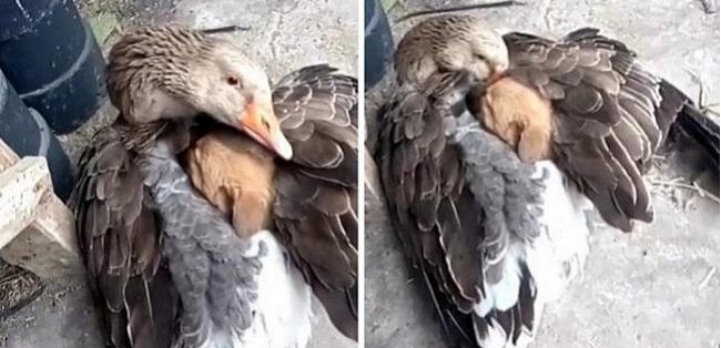 A homeless little puppy froze right on the street. Apparently, his mother left him or the little animal got lost. It is not known how it would have ended if a goose had not passed nearby. The bird very quickly realized that the dog definitely needed help. The goose came closer and carefully covered the baby with its wing, trying to warm it up in this way!
