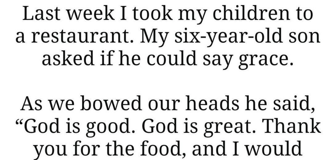 As the family bowed their heads, the boy said, “God is good. God is great. Thank you for the food, and I would even thank you more if Mom gets us ice cream for dessert. And Liberty and justice for all! As customers sitting nearby laughed at the prayer, the mother heard one woman say, “That’s what’s wrong with this country.Kids today don’t even know how to pray. Asking God for ice-cream! Why, I never!” The mother’s son burst into tears as soon as he heard this, asking her “Did I do it wrong? Is God mad at me?” As the mother sat comforting her son, an elderly man walked up to them and winked at the little boy. A mother has just taken to social media to reveal what happened when she recently took her family to a local restaurant.
