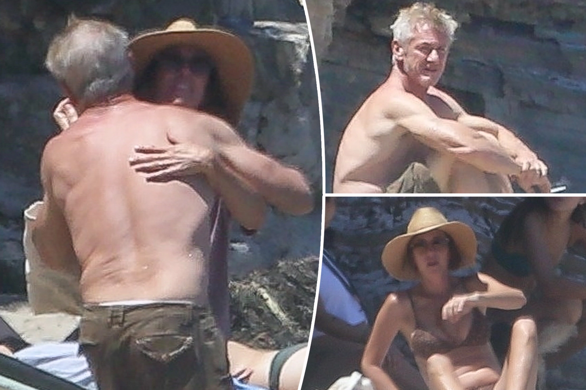 The “Bridesmaids” star wore a brown bikini and straw hat for the outing, while the “I Am Sam” star sported only a pair of cargo shorts.
